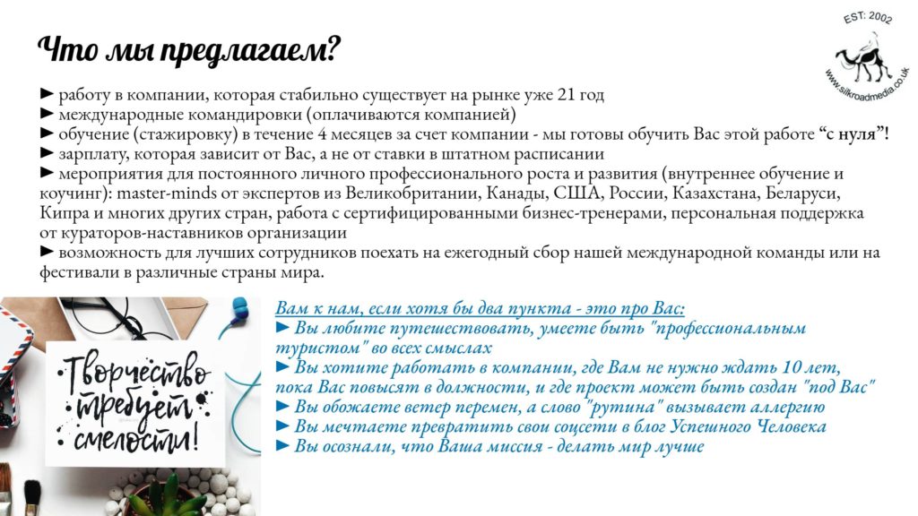 ▶ приветствуются опыт и навыки в маркетинге, продажах и рекламе