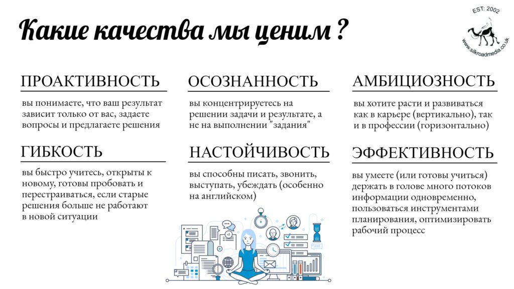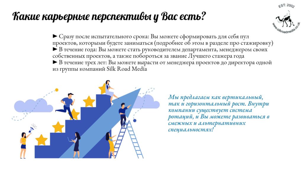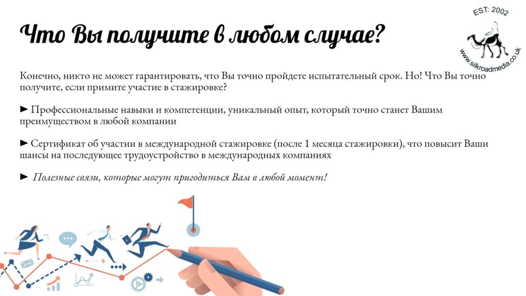 - Обычно в Великобритании стажеры платят за шанс учиться у действующих лидеров рынка, и, если бы вы были британцами, вам пришлось бы заплатить не меньше 8 000 фунтов за те знания и навыки, которые члены нашей команды нарабатывали годами (и платили за это деньги). Мы готовы поделиться этими сокровищами в обмен на ваше время. Если вы еще не адаптировались к современным трудовым реалиям, где самое ценное — это умение учиться, то, возможно, вам не подойдет работа в нашей компании.