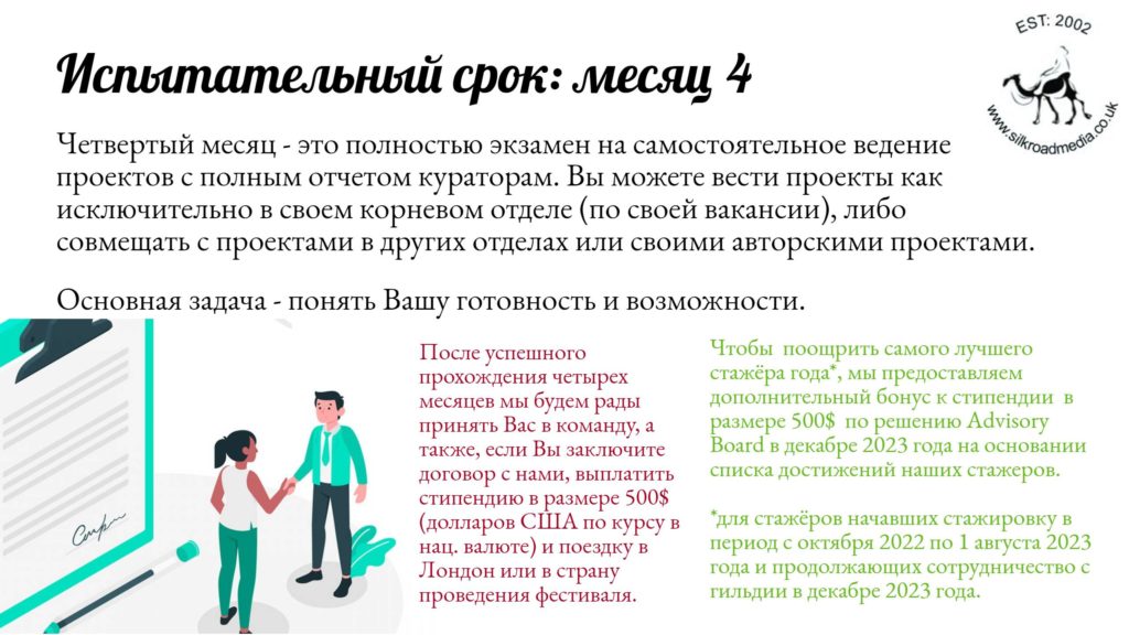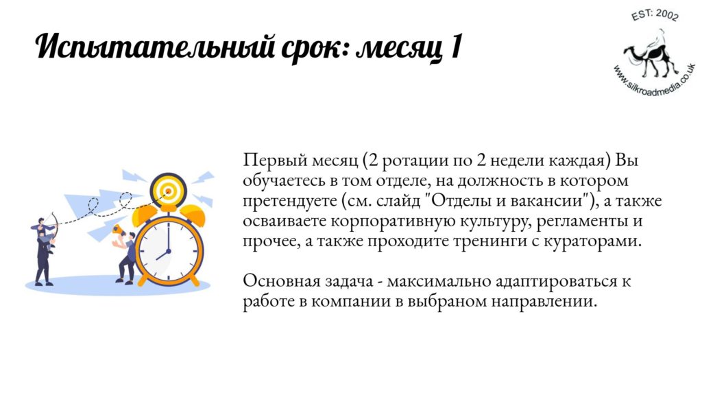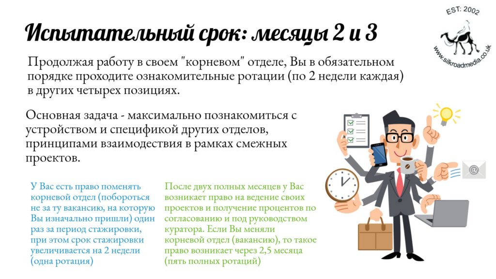 - Мы не обещаем (и никогда не обещали), что вы обязательно пройдете испытательный срок — стажировку. И в нашей практике действительно были случаи, когда на четвертом месяце, где самостоятельная работа показывает, кто чего стоит, для некоторых кандидатов стажировка завершалась. Как правило, из 10-16 кандидатов до конца стажировки доходят 1-3 самых амбициозных и талантливых, которых мы действительно готовы отправить в Лондон, Мельбурн, Паттайю и другие прекрасные места.