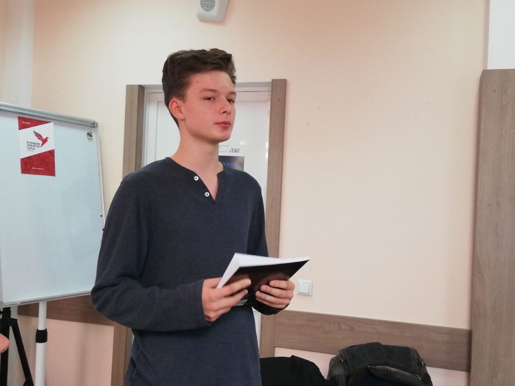 На встрече прошла презентация книги азербайджанского писателя Камрана Салаева “Elish and the wicker tale”, которую провел Тимур Ахмеджанов — переводчик и иллюстратор книги. Тимур прочитал отрывки из книги на английском языке и рассказал о том, как работал с ней.