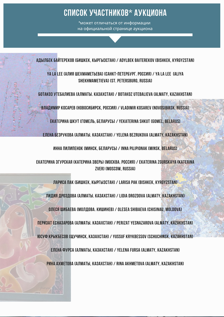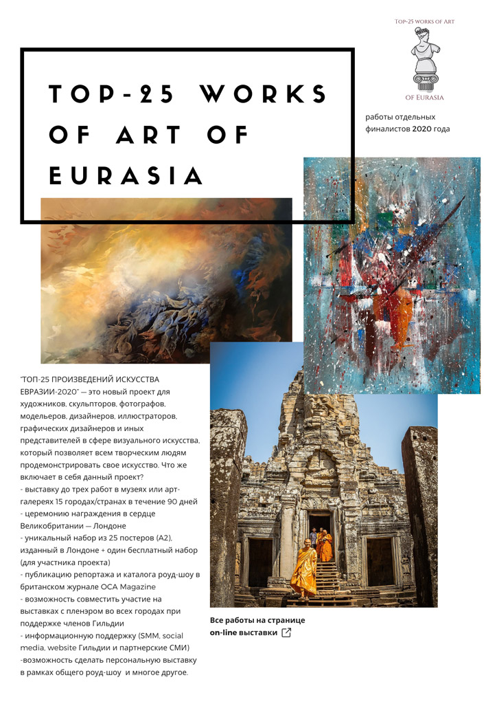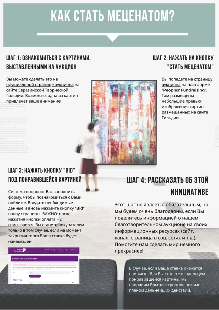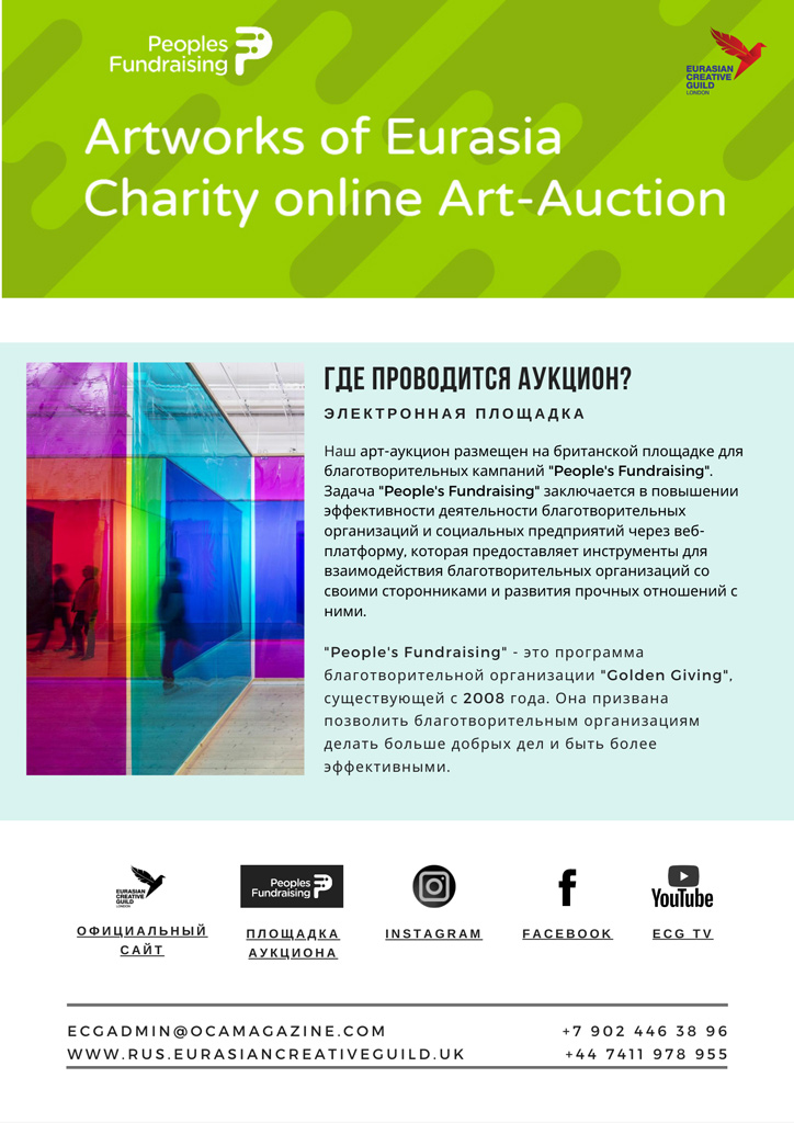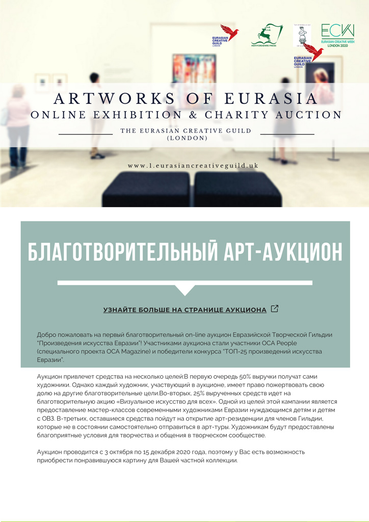 Евразийская Творческая Гильдия запустила новую инициативу — первый благотворительный арт-аукцион «Произведения искусства Евразии», который призван привлечь внимание к работам художников стран Евразии. Подробности вы можете найти на страницах брошюры ниже.