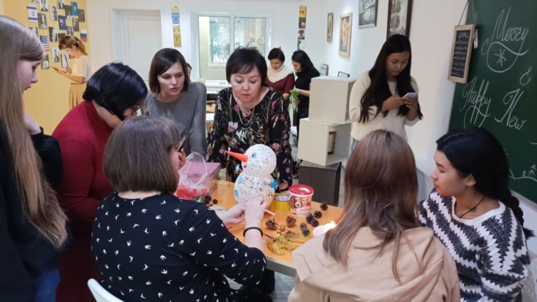 В резиденции Евразийской Творческой Гильдии 27 ноября состоялось мероприятие, в котором приняли участие мастера-преподаватели по декоративно-прикладному искусству Высшего педагогического колледжа, студенты Высшего технического колледжа и многие известные и уважаемые творческие личности города. Поводом встречи были предстоящие Рождественские и новогодние праздники. Участники мероприятия попытались воплотить идею объединения традиций разных культур в праздничном декоре: католического Рождества с элементами национального казахского колорита. В итоге работы получились особенными и вызвали восторг и восхищение.