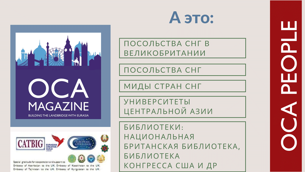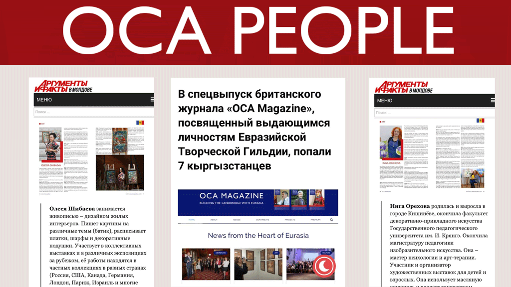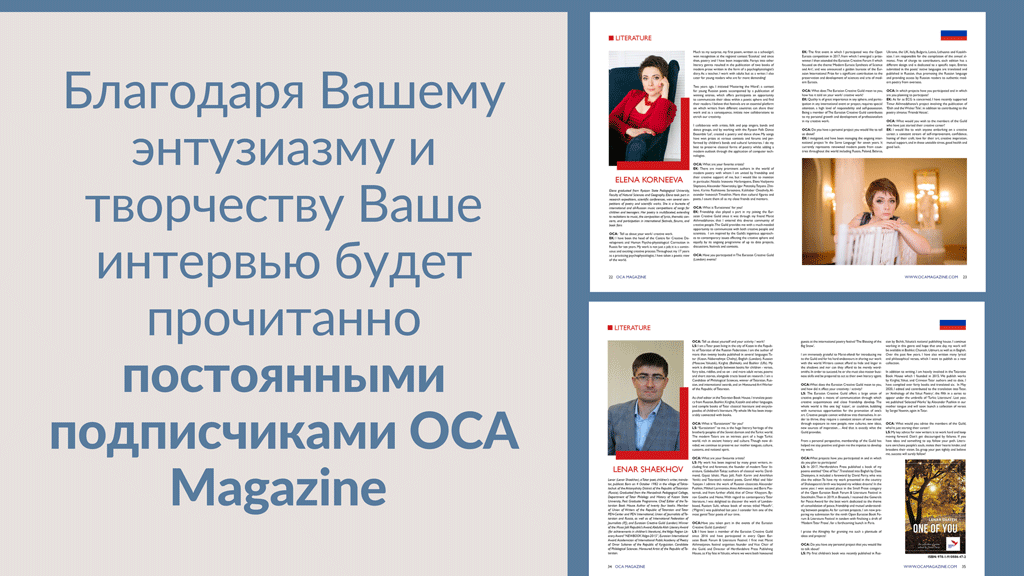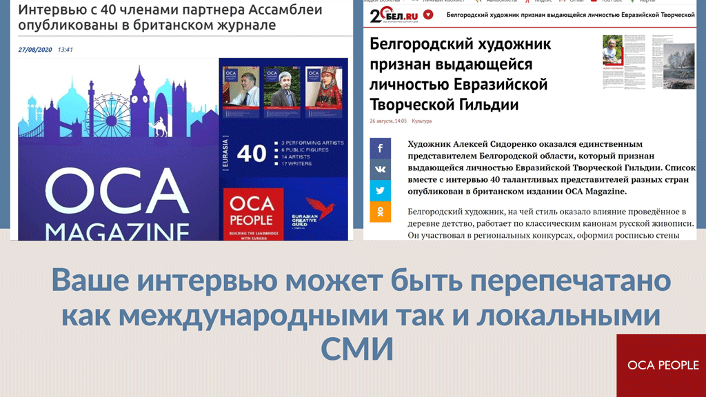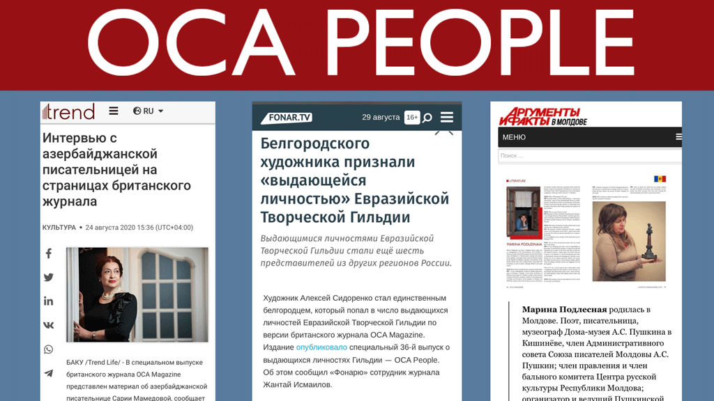 Спецпроект журнала OCA Magazine, направленный на продвижение талантливых деятелей искусства Евразийского региона, оказался не только значимым, но и успешным. Через него писатели, художники, публицисты и другие творческие люди смогли заявить о себе, что привлекло, в том числе, и внимание международных СМИ! Поэтому журнал OCA People вновь будет выпущен в 2021 году. Мы приглашаем к участию всех активных членов Евразийской Творческой Гильдии (Лондон)!